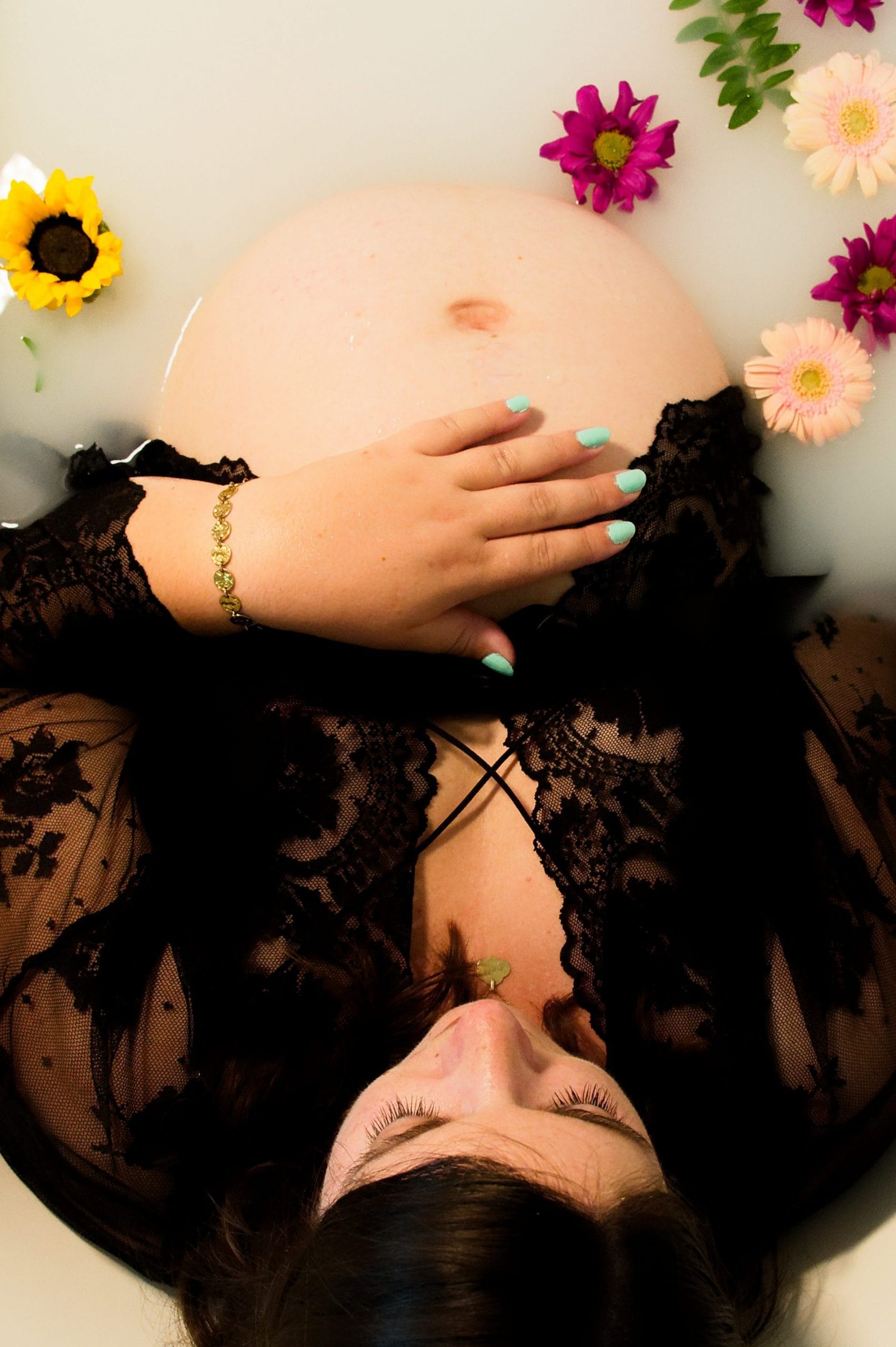 Mettre en valeur les courbes : la lumière et la blancheur du lait subliment la silhouette de la future maman.