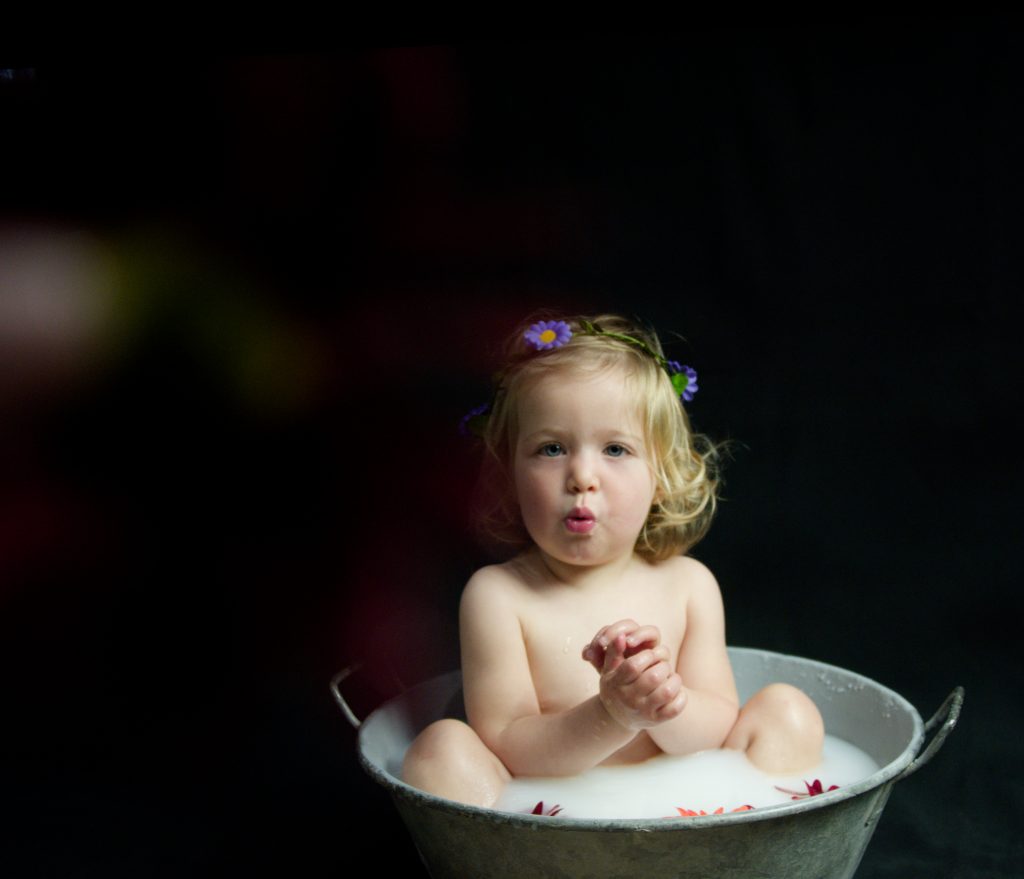 Dans une cuve joliment installée, baignée de lumière naturelle, un petit modèle s’est laissé porter par l’instant. L’eau laiteuse, parsemée de fleurs fraiches ou de fruits colorés, transforme le décor en une scène digne d’un conte.